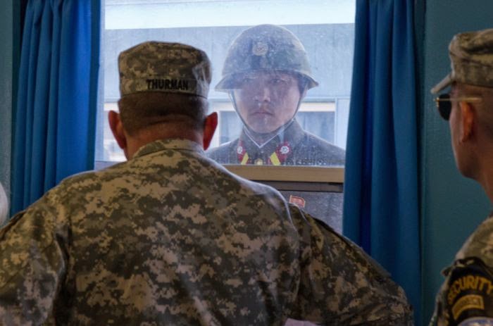 The South Koreans stand partially hidden to present less of a target, and stand well away from the actual border, as there have apparently been instances of guards being pulled and abducted into the North. All the SK guards are at least 5′ 7″, and have a black belt in Tae Kwan Do or Judo.